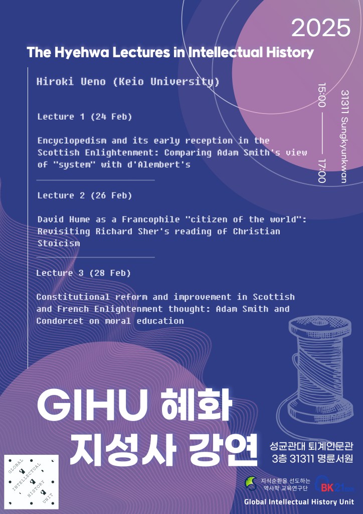 | What | Lecture 1. (15:00, 24 Feb 2025) Encyclopedism and its early reception in the Scottish Enlightenment: Comparing Adam Smith’s view of “system” with d’Alembert’s Lecture 2. (15:00, 26 Feb 2025) David Hume as a Francophile “citizen of the world”: Revisiting Richard Sher’s reading of Christian Stoicism Lecture 3. (15:00, 28 Feb 2025) Constitutional reform and improvement in Scottish and French Enlightenment thought: Adam Smith and Condorcet on moral education |